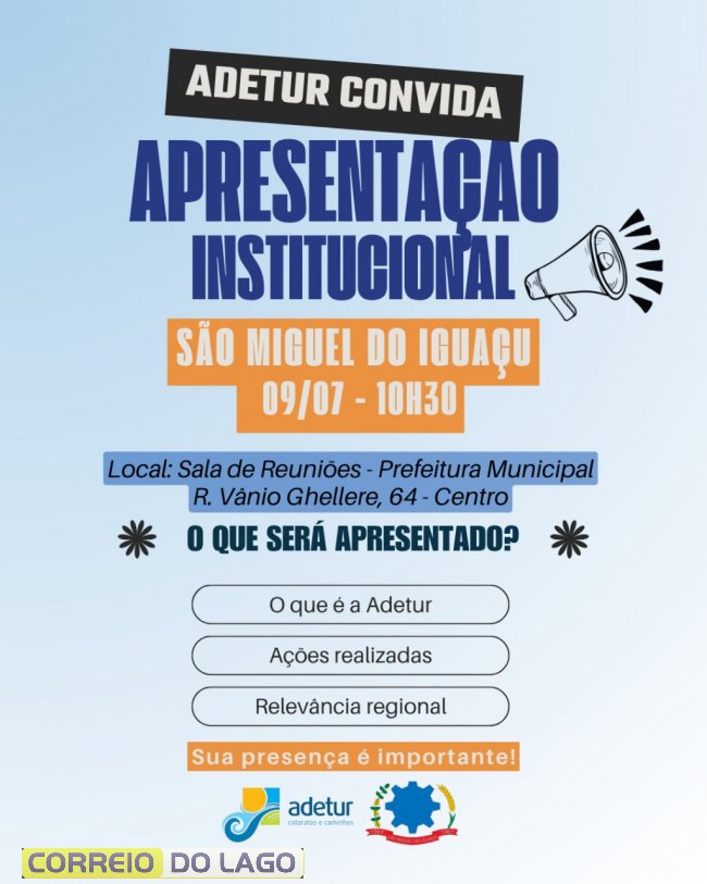 A Adetur Cataratas e Caminhos iniciará, a partir do dia 9 de julho, uma série de apresentações institucionais nos 19 municípios de sua área de atuação, com o objetivo de sensibilizar empresários do setor turístico e a comunidade em geral sobre a importância da associação para o desenvolvimento regional. As ações também visam captar novos associados.