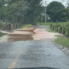 A água invadiu uma área de pastagem com gado e alcançou parte da estrada que passa pelo local.