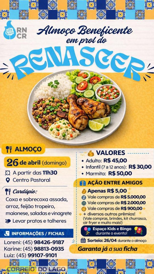 O Grupo Renascer, movimento da Igreja Católica presente em Santa Helena, realiza no próximo dia 26 de abril, domingo, um almoço beneficente com o objetivo de arrecadar recursos para seus encontros espirituais ao longo do ano. A programação começa a partir das 11h30 e promete reunir famílias, amigos e toda a comunidade em um momento de convivência e fé.