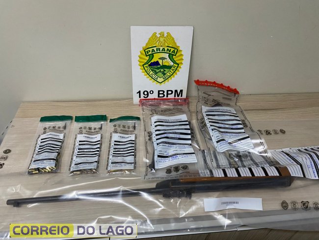 Após a retirada do autor do local, familiares relataram que vinham sofrendo agressões frequentes e ameaças, inclusive com o uso de armas de fogo. Com o acompanhamento da equipe policial, foram realizadas buscas na residência, resultando na apreensão de um verdadeiro arsenal: um revólver calibre .38, um revólver calibre .32, uma espingarda de pressão modificada para o calibre .22 e 104 munições de diversos calibres.