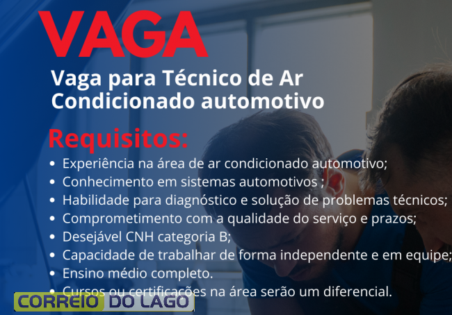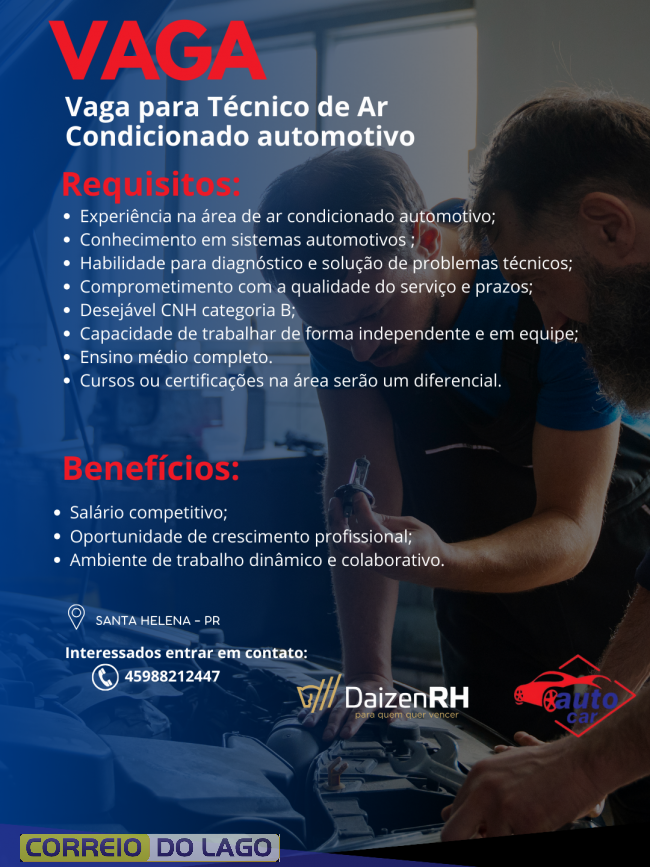 A Auto Car, empresa do setor automotivo em Santa Helena, está com vaga aberta para técnico em ar-condicionado automotivo, destinada a profissionais com experiência na área e conhecimento em sistemas automotivos. A função envolve diagnóstico e solução de problemas técnicos, com foco na qualidade do serviço e no cumprimento de prazos.