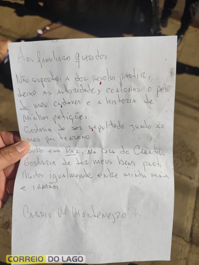 Na carta, o autor do ataque pediu que fosse sepultado ao lado do pai e afirmou que não suportava mais a dor que sentia, justificando assim sua decisão. Também solicitou que seus bens fossem divididos entre os familiares.