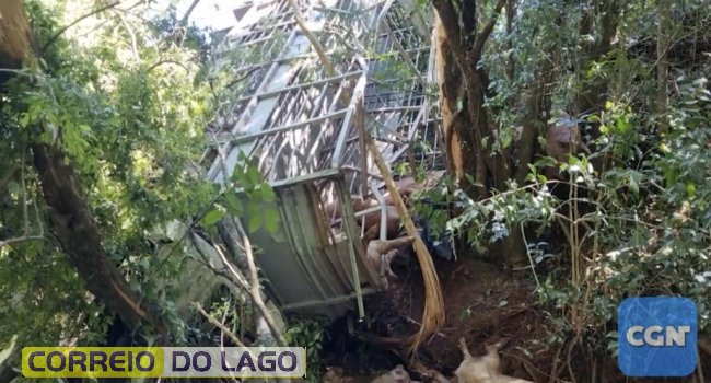 Um grave acidente de trânsito foi registrado na tarde desta sexta-feira (19) na rodovia PR-180, no Distrito de Rio do Salto, em Cascavel. Um caminhão carregado com suínos saiu da pista, tombou em uma ribanceira e caiu em uma cachoeira, a cerca de 200 metros da rodovia.