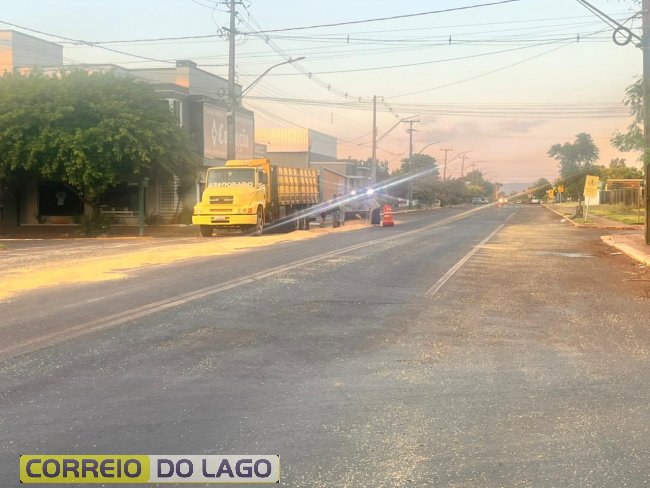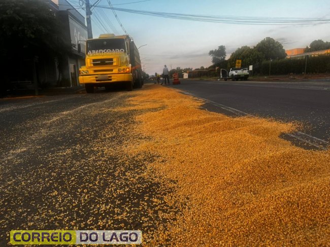 Na tarde deste sábado (31), por volta das 18h35, um caminhão carregado com grãos de soja acabou espalhando grande parte da carga pela rodovia PR-317, no perímetro urbano de Santa Helena conhecido como Rua Ângelo Cattani.