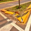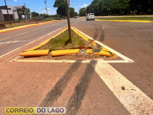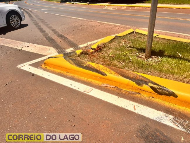 Com o impacto, alguns meios-fios foram quebrados e marcas de frenagem ficaram visíveis na pista, indicando uma tentativa de evitar um dano maior.