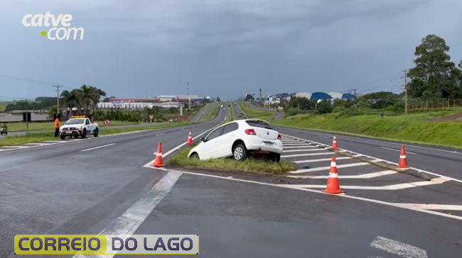 Carro sai da pista e para na canaleta da BR-277 em Cascavel