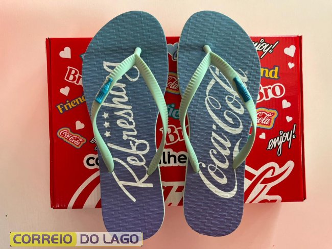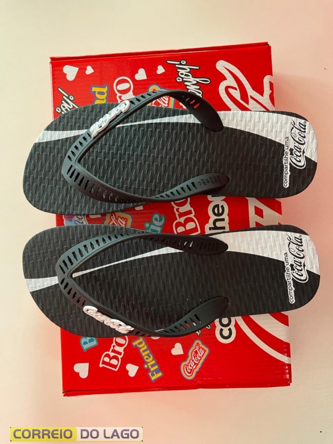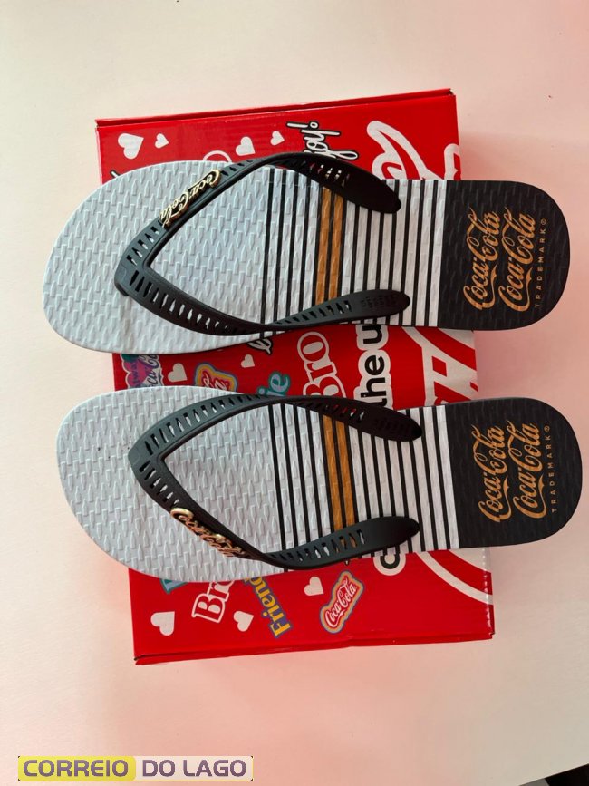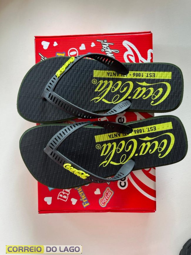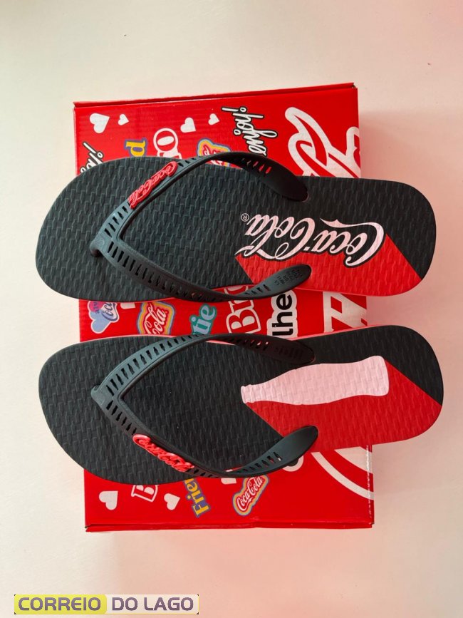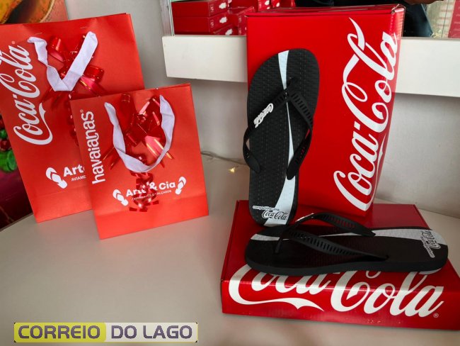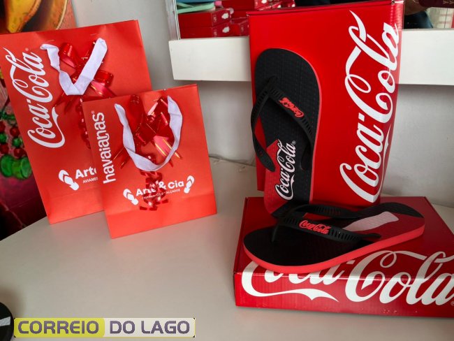 Chinelos Coca-Cola masculino e feminino entram em oferta especial de Natal na Arte&Cia de Santa Helena por R$ 69,90; confira de perto