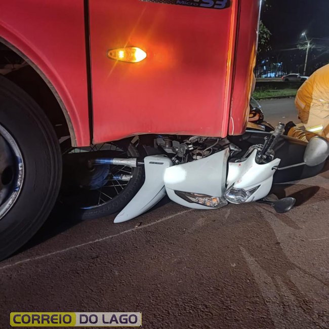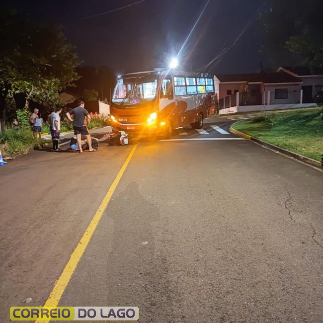 Uma batida entre um ônibus do transporte coletivo e uma moto deixou uma mulher ferida na noite de terça-feira (27), em Toledo. O acidente aconteceu no cruzamento da Rua Pastor Ulve com a Rua Romano Fidelski, no bairro Jardim Pancira.