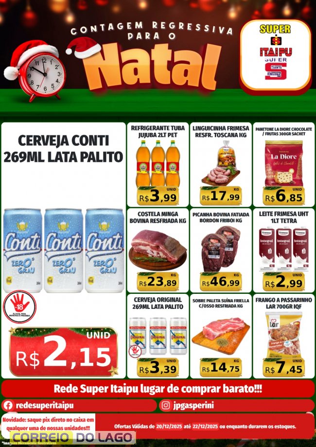 Neste sábado (20), a expectativa pro Natal só aumenta e clima de Natal vem acompanhado de preços baixos no Super Itaipu e no Super Santa Helena promoção válida para o fim de semana 20 a 22 ou enquanto durarem os estoques, os lugares certos para quem quer economizar nas compras. São ofertas imperdíveis para garantir tudo o que precisa pagando menos, com promoções válidas somente para hoje ou enquanto durarem os estoques. Aproveite e faça suas compras com qualidade, variedade e economia.