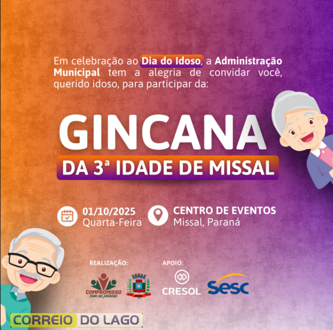 O dia Internacional da Pessoa Idosa, ou simplesmente Dia do Idoso, será celebrado com uma descontraída Gincana na quarta-feira, dia 01 de outubro, em Missal. O evento inicia as 13h30 no Centro de Eventos do município e a expectativa da organização é de que todos os grupos da Melhor Idade de Missal participem.