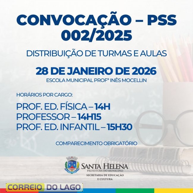 A Secretaria Municipal de Educação e Cultura de Santa Helena publicou edital de convocação dos professores que apresentaram a documentação exigida no Processo Seletivo Simplificado nº 02/2025. A convocação é destinada à distribuição de turmas e aulas para o ano letivo.