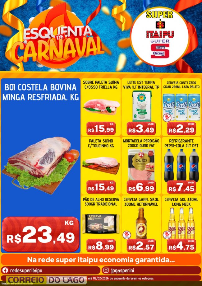 Esquenta Carnaval une folia e preços baixos no Super Itaipu e Super Santa Helena. Confira as ofertas