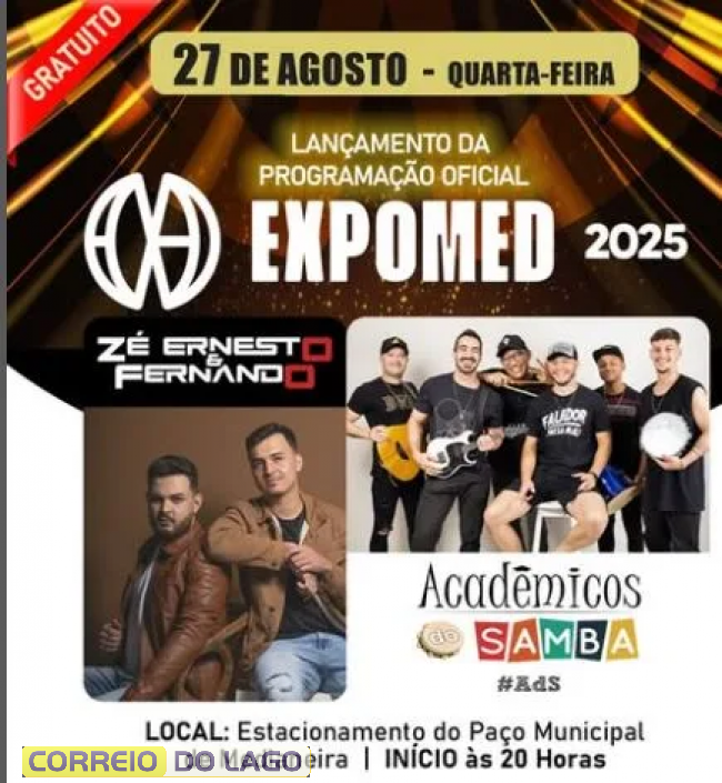 Nesta quarta-feira (27) será o lançamento oficial da programação da EXPOMED 2025 que acontecerá em outubro, um dos eventos mais aguardados da região. A cerimônia acontece no estacionamento do Paço Municipal, a partir das 20 horas.