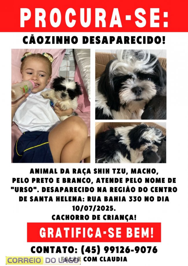 Um cachorro chamado Urso está desaparecido desde a manhã desta quinta-feira (10), nas proximidades da Rua Bahia, em Santa Helena. O animal pertence a uma criança que está profundamente abalada com o sumiço do companheiro de estimação.