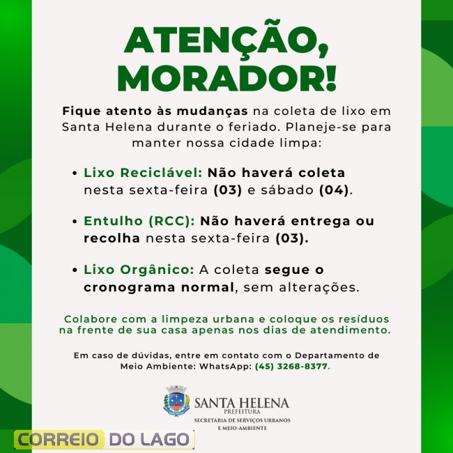 Em razão do feriado, a Administração Municipal de Santa Helena confirmou alterações nos serviços de limpeza pública e recolhimento de resíduos. Os moradores devem ficar atentos aos dias específicos em que as equipes não passarão nas residências.
