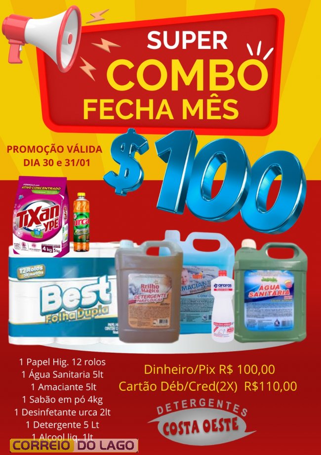 O valor do combo é de R$ 100,00 para pagamento em dinheiro ou Pix, e R$ 110,00 no cartão de débito ou crédito, com opção de parcelamento em até duas vezes. Aproveite a promoção e garanta o seu super combo na Detergentes Costa Oeste, em Santa Helena.