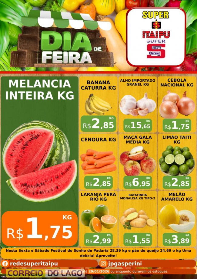 Nesta quarta-feira (28), o dia de feira no Super Itaipu e no Super Santa Helena chega com folia de promoções imperdíveis, ofertas especiais em diversos setores e preços que cabem no bolso. Aproveite produtos fresquinhos, variedade e economia de verdade. Confira as ofertas!
