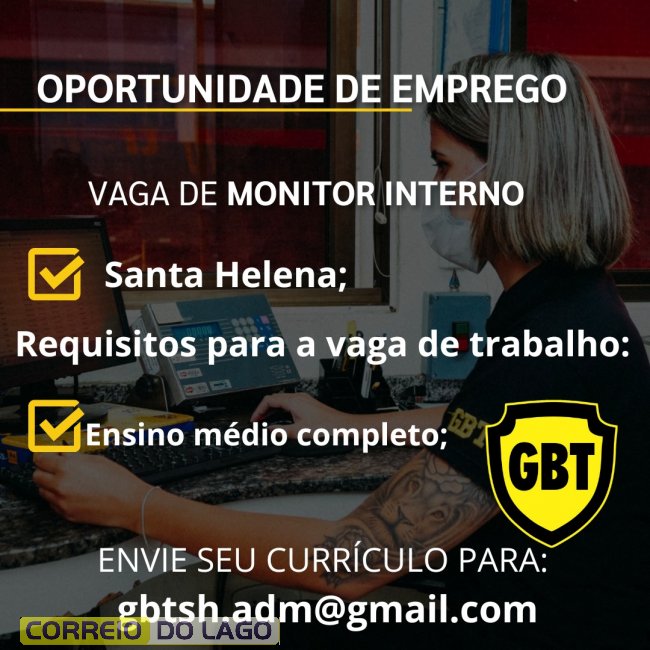 A empresa GBT Sistemas de Segurança, com sede em Santa Helena, está com processo seletivo aberto para a contratação de um monitor interno para atuar no período diurno, em escala 12x36.