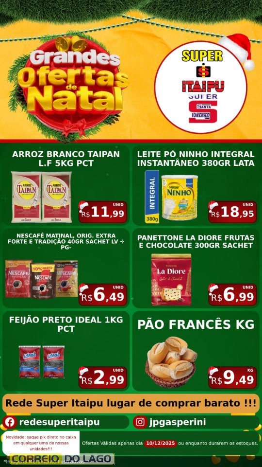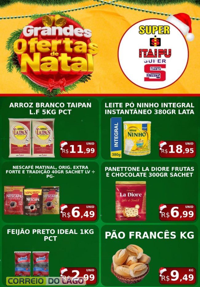 Nesta quarta-feira (10), o Super Itaipu e o Super Santa Helena trazem grandes ofertas de Natal para você garantir suas compras com economia e qualidade. A promoção é válida somente hoje, ou enquanto durarem os estoques, reunindo preços especiais em diversos produtos para antecipar o clima natalino e deixar sua ceia ainda mais completa. Aproveite!