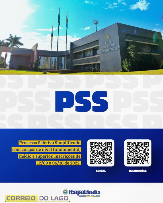 A Administração Municipal de Itaipulândia anunciou a abertura do Processo Seletivo Simplificado (PSS) com oportunidades para cargos de nível fundamental, médio e superior. Entre os cargos disponíveis estão Advogado, Agente Comunitário de Saúde, Dentista, Enfermeiro, Médico (Clínico Geral, Ginecologista, Pediatra), Engenheiro Civil, Professor em diversas áreas, Psicólogo, Nutricionista, Operador de Máquinas, entre outros.