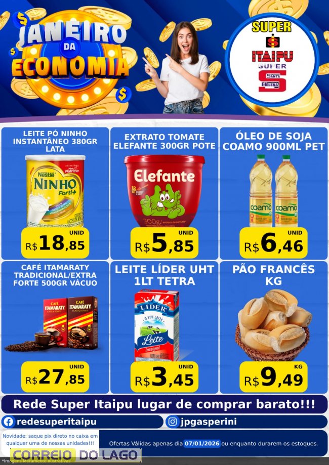 O mês de janeiro já inicia com economia garantida no Super Itaipu e no Super Santa Helena. Nesta quarta-feira (07), os clientes encontram ofertas especiais em diversos produtos. É a oportunidade ideal para abastecer a despensa e iniciar o mês pagando menos. As ofertas são válidas para esta quarta-feira (07) e quinta-feira (08), ou enquanto durarem os estoques.