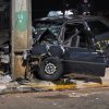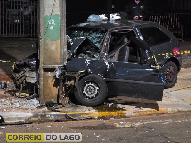 O veículo Volkswagen Gol ficou destruído após atingir um poste de iluminação público. As causas do acidente devem ser investigadas.