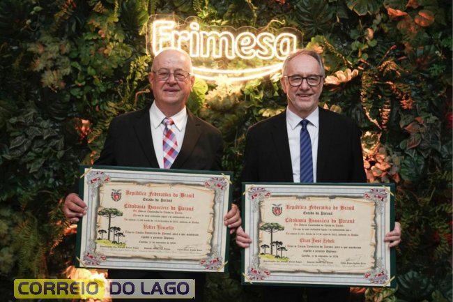 Em uma noite marcada por emoção e reconhecimento cívico, a Assembleia Legislativa do Paraná (ALEP) realizou, no dia 05 de dezembro, na Assercoop, em Medianeira, a solenidade de entrega do Título de Cidadão Honorário do Paraná a Valter Vanzella e Elias José Zydek, ex-presidente e atual presidente da Frimesa. A honraria, uma das mais altas concedidas pelo Estado, destacou o impacto das gestões de ambos no desenvolvimento econômico e social da região Oeste e de todo o Paraná.