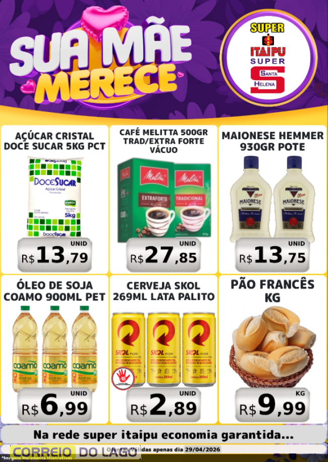 Nesta quarta-feira (29), o Super Itaipu e o Super Santa Helena realizam a campanha "Sua mãe merece", com variedade de produtos para o dia a dia. Com preços acessíveis, facilitando as compras com opções práticas e econômicas para toda a semana.