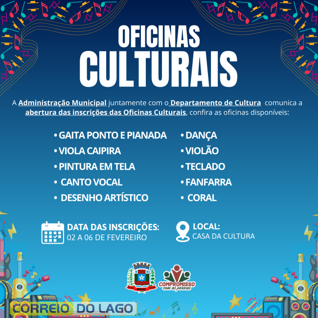 O Departamento de cultura de Missal irá abrir as matrículas para as Oficinas Culturais de 2026. As inscrições ocorrem na Casa da Cultura entre os dias 02 e 06 de fevereiro. Serão ofertadas oficinas de Dança, Violão, Viola Caipira, Teclado, Gaita Ponto e Pianada, Pintura em tela, Desenho Artístico, Canto, Coral e Fanfarra.