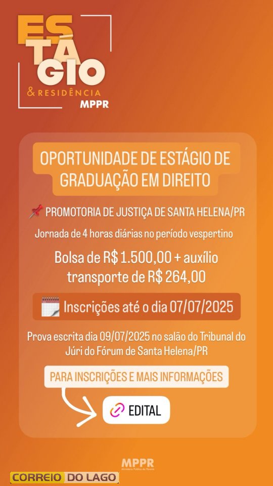O edital completo, com conteúdos exigidos, critérios de classificação e informações sobre cotas para negros e pessoas com deficiência, está disponível no site da Escola Superior do Ministério Público do Paraná: https://escolasuperior.mppr.mp.br/estagios. O prazo de validade da seleção é de um ano, contado a partir da divulgação do resultado final.