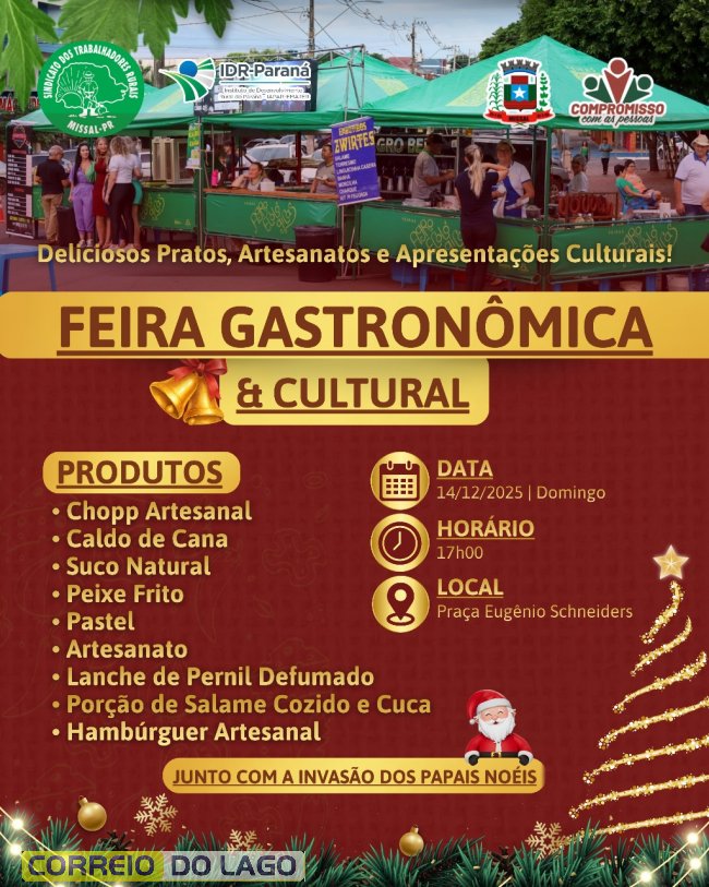 O evento reúne sabores únicos da agricultura familiar, com produtos preparados pelos próprios produtores locais. A programação ganha ainda mais encanto com a tradicional Invasão dos Papais Noéis, organizada pela Acimi (Associação Comercial e Empresarial de Missal), que acontece das 18h às 19h.