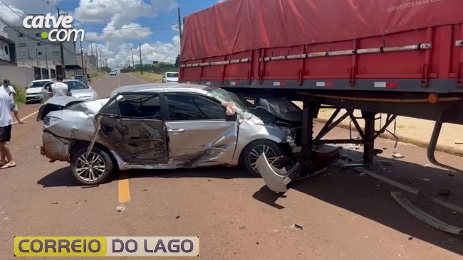 Um homem de 26 anos ficou ferido após bater o carro que conduzia contra uma carreta na Avenida Expresso Norte, no bairro Florais do Paraná, em Cascavel, no fim da manhã de domingo (25).