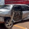 Motorista fica ferido após carro atingir árvore e parar embaixo de carreta em Cascavel