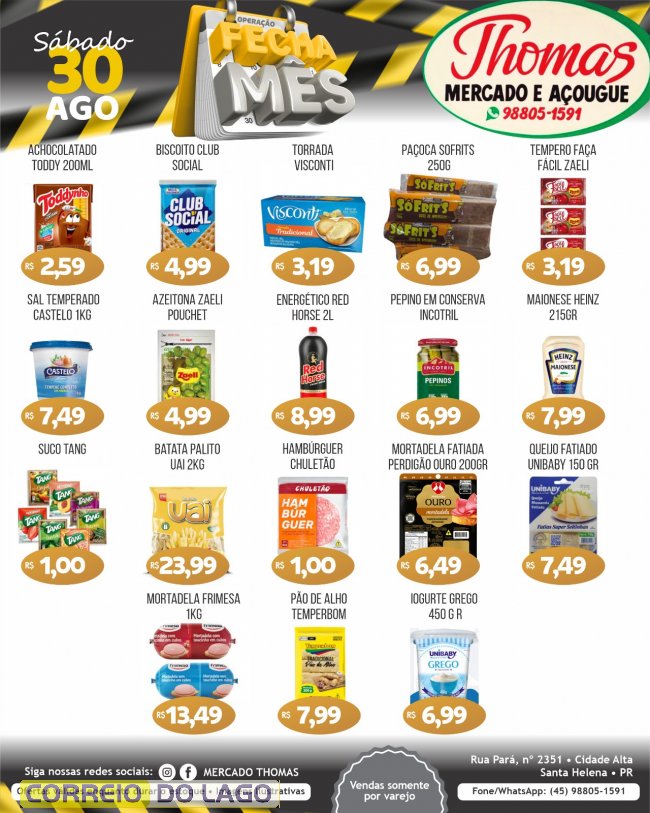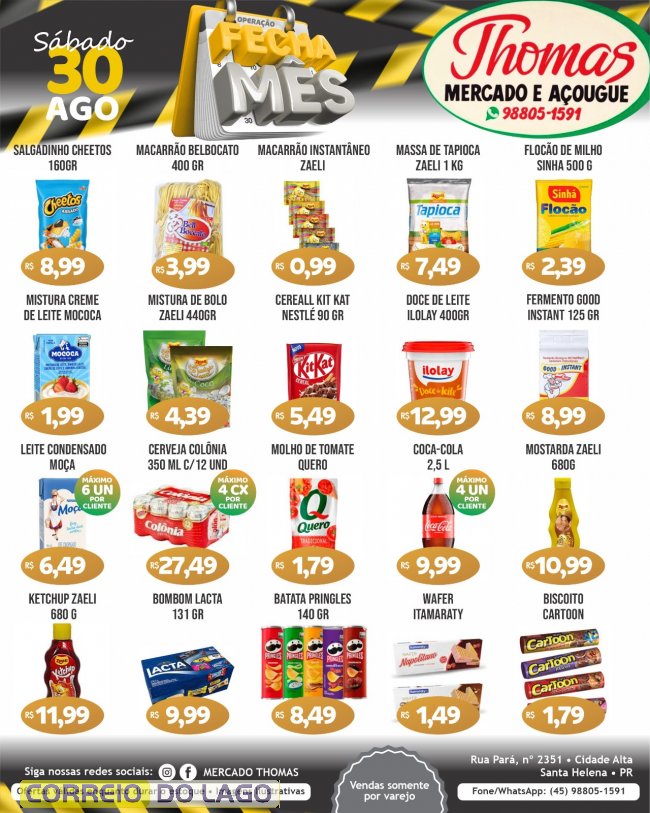 O Mercado Thomas de Santa Helena realiza neste sábado (30) a Operação Fecha Mês, com descontos especiais em carnes e diversos produtos. Clientes tem a oportunidade de economizar nas compras do fim de mês, com preços reduzidos em itens de mercearia e cortes de carne selecionados, válidos apenas durante o dia.