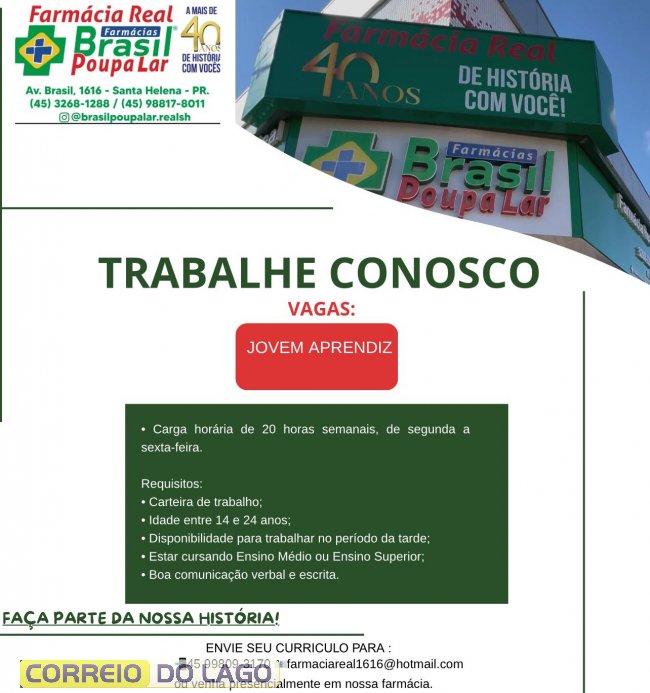 Além disso, a Farmácia Real também está contratando jovem aprendiz, com carga horária de 20 horas semanais, de segunda a sexta-feira, no período da tarde. Podem se candidatar jovens entre 14 e 24 anos, com carteira de trabalho, que estejam cursando o ensino médio ou superior e tenham boa comunicação. Os interessados podem enviar o currículo pelo WhatsApp (45) 99809-3170, pelo e-mail farmaciareal1616@hotmail.com ou comparecer pessoalmente à farmácia para mais informações.