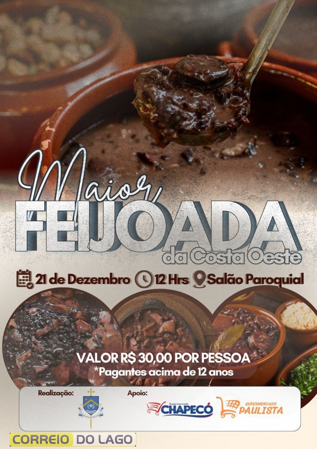 No dia 21 de dezembro, a programação inicia com a Santa Missa em Ação de Graças pelos 38 anos de emancipação de Diamante D’Oeste, celebrada às 10h, na Igreja Matriz. Na sequência, a partir das 12h, será realizado o almoço comemorativo, conhecido como a maior feijoada da Costa Oeste, no Salão Paroquial. O valor é de R$ 30,00 por pessoa, para participantes acima de 12 anos.