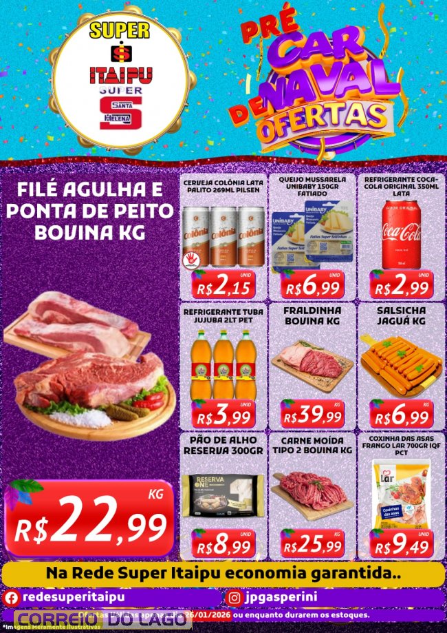 Nesta segunda-feira (26), o clima de Pré e Esquenta Carnaval já tomou conta do Super Itaipu e do Super Santa Helena, com ofertas especiais que garantem a melhor economia para sua semana. É a oportunidade ideal para antecipar as compras, aproveitar preços imbatíveis e fazer tudo com tranquilidade e variedade.