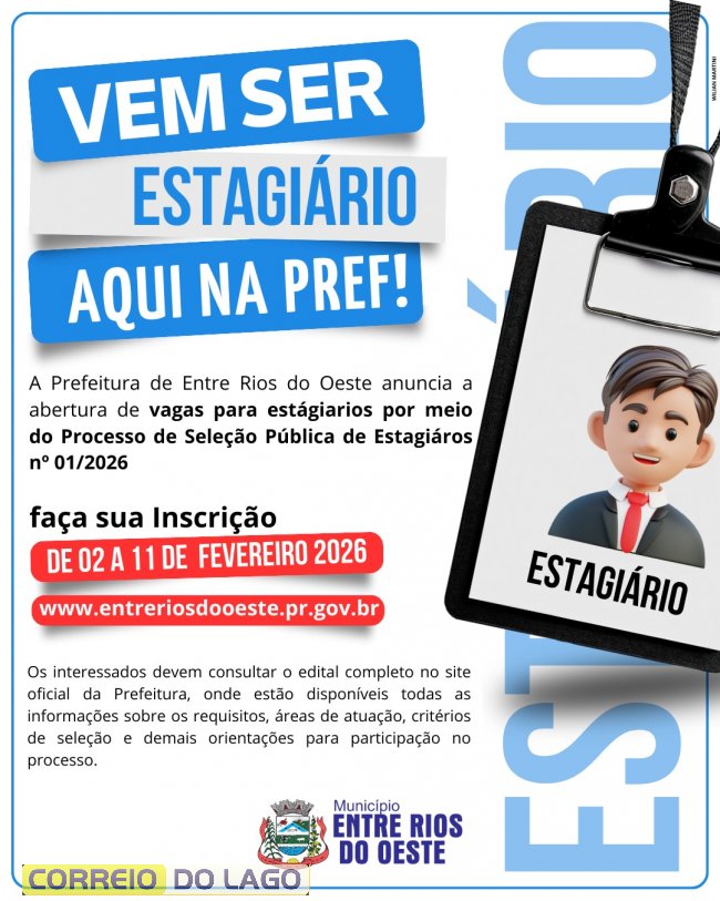 A Prefeitura de Entre Rios do Oeste abriu inscrições para o Teste Seletivo nº 01/2026, destinado à contratação de novos estagiários para o quadro municipal. O processo oferece oportunidades para estudantes de níveis médio e superior em diversas áreas, como Administração, Direito, Arquitetura e Educação Física.