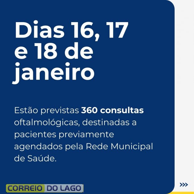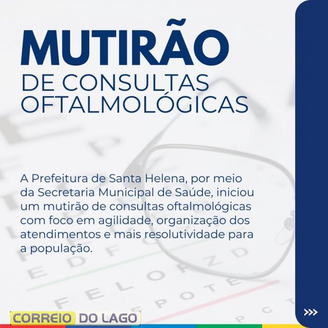 A Prefeitura de Santa Helena, por meio da Secretaria Municipal de Saúde, inicia nesta semana um mutirão de consultas oftalmológicas com o objetivo de ampliar o acesso da população aos atendimentos especializados e garantir maior agilidade nos diagnósticos e encaminhamentos. Nos dias 16, 17 e 18 de janeiro, estão previstas 360 consultas oftalmológicas, contemplando pacientes previamente agendados pela Rede Municipal de Saúde.