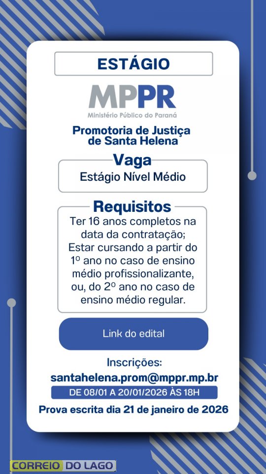 A Promotoria de Justiça da Comarca de Santa Helena, abriu processo seletivo para a contratação de estagiário do ensino médio, conforme edital assinado pelo promotor de Justiça Dr. Lucas Gabriel Scheidweiler.