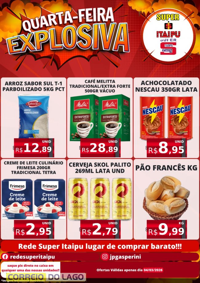Os supermercados Super Itaipu e Super Santa Helena promovem nesta quarta-feira duas campanhas especiais de economia para os clientes: a “Quarta-feira Explosiva” e as “Super Ofertas do Hortifruti”. A ação reúne preços reduzidos em diversos produtos do dia a dia, desde itens básicos da despensa até frutas, legumes e verduras selecionados, oferecendo uma oportunidade para quem deseja aproveitar boas ofertas e abastecer a casa com mais economia.