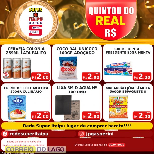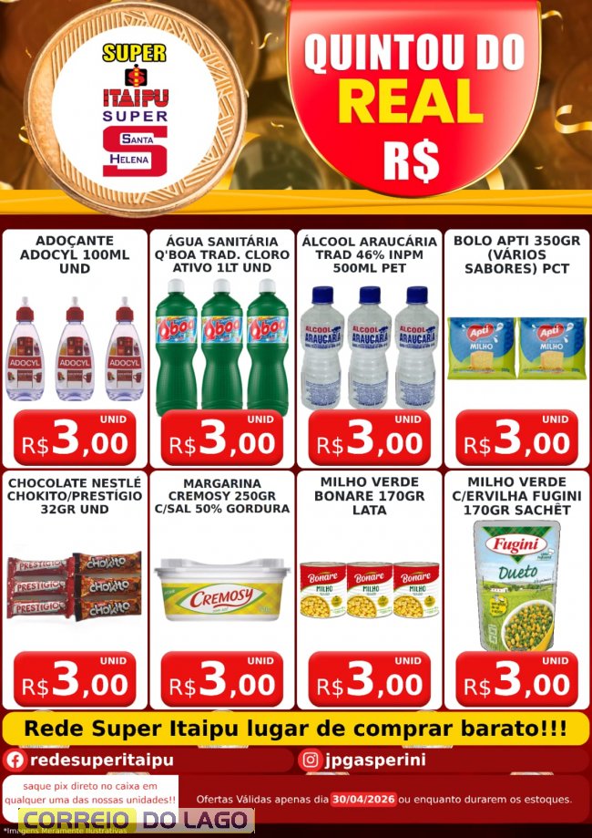 As condições são válidas apenas para está Quinta-feira (30), ou enquanto durarem os estoques. Mais informações podem ser conferidas diretamente nas lojas Super Itaipu e Super Santa Helena.