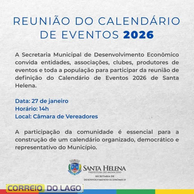 A Secretaria Municipal de Desenvolvimento Econômico promove na próxima terça-feira (27), às 14h uma reunião para discutir e organizar o Calendário de Eventos 2026 do Município.