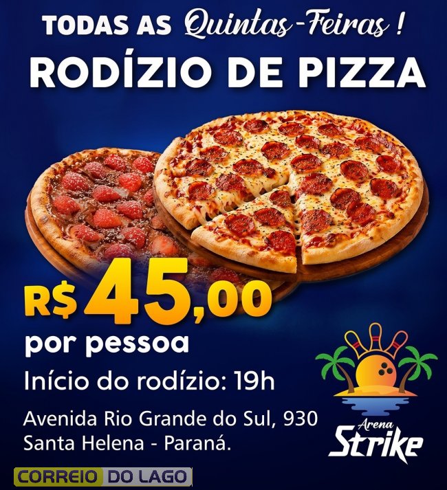 Sabe aquela quinta que pede uma pausa na rotina? A Arena Strike, em Santa Helena, prepara mais uma noite de rodízio de pizza nesta quinta-feira (23), a partir das 19h, com opções para comer bem e curtir sem pressa.
