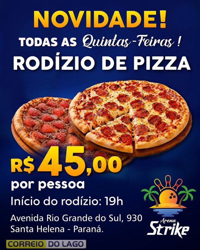 O Arena Strike inicia nesta quinta-feira (16) uma nova opção gastronômica para as noites na cidade. A programação ocorre todas as quintas-feiras, a partir das 19h, com rodízio de pizzas acompanhado de batata frita, frango à milanesa e macarrão alho e óleo.