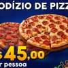 O valor é de R$ 45 por pessoa, com variedade de sabores entre pizzas salgadas e doces, além dos acompanhamentos inclusos no rodízio.