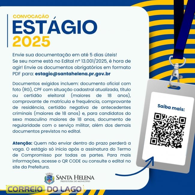De acordo com o edital, os convocados devem encaminhar, em formato PDF, a documentação exigida para o e-mail estagio@santahelena.pr.gov.br no prazo de 5 (cinco) dias úteis, contados a partir do dia útil seguinte à data de publicação. Entre os documentos solicitados estão: documento de identificação com foto, CPF com situação cadastral atualizada, comprovante de matrícula e frequência, comprovante de residência, comprovante de regularidade eleitoral e, quando for o caso, documento de regularidade com o serviço militar e certidão negativa de antecedentes criminais.