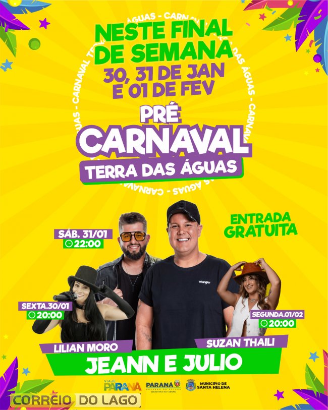 Santa Helena já respira alegria e animação com a chegada do Pré-Carnaval Terra das Águas, que promete movimentar o Balneário Municipal neste fim de semana. O evento, com entrada gratuita, traz uma programação especial com música ao vivo, lazer e diversão, reunindo artistas regionais e visitantes de toda a região.