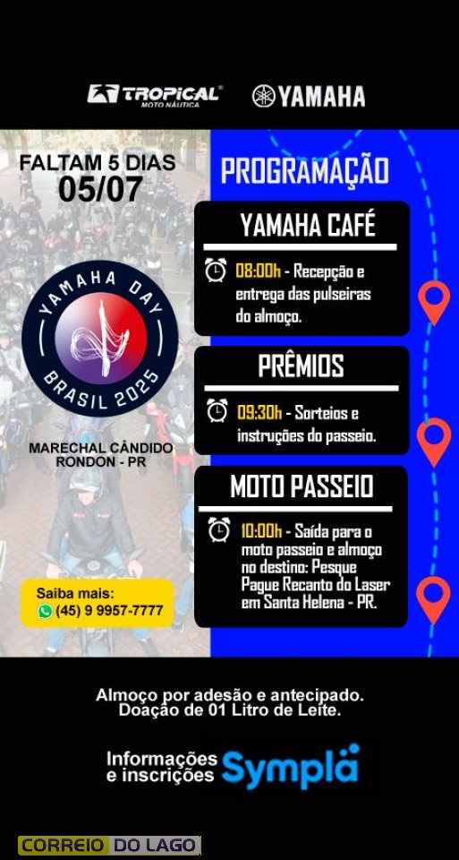 Neste sábado (05), Santa Helena será o destino final do Yamaha Day 2025, evento promovido pela concessionária Tropical Yamaha em comemoração aos 70 anos da marca. A programação inicia em Marechal Cândido Rondon, mas o encerramento será em solo santa-helenense, reunindo mais de 200 motociclistas em um dia marcado por aventura, solidariedade e paixão por duas rodas.