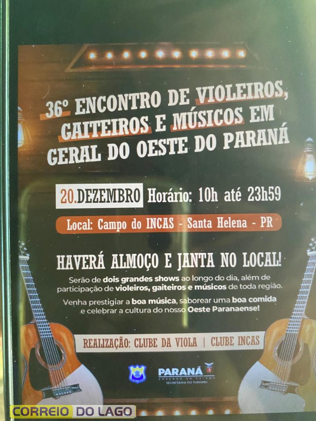 A manhã começa com o 36º Encontro de Violeiros, Gaiteiros e Músicos em Geral do Oeste do Paraná. Com início às 10h, o evento celebra a cultura local com apresentações musicais e a presença de artistas de toda a região. Para acompanhar a música, será servido um almoço no local, dedicado aos amantes da moda de viola.